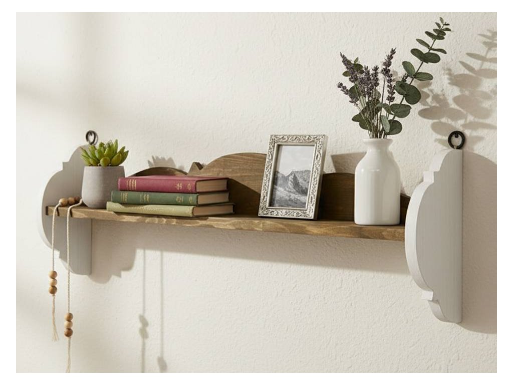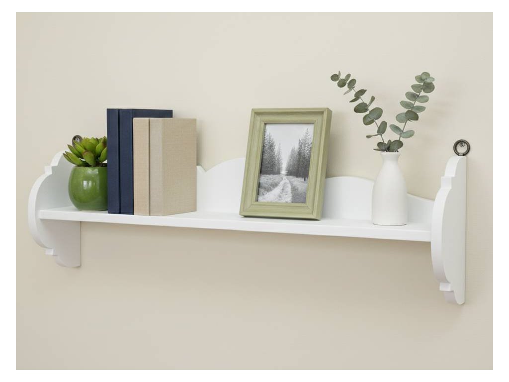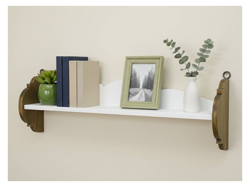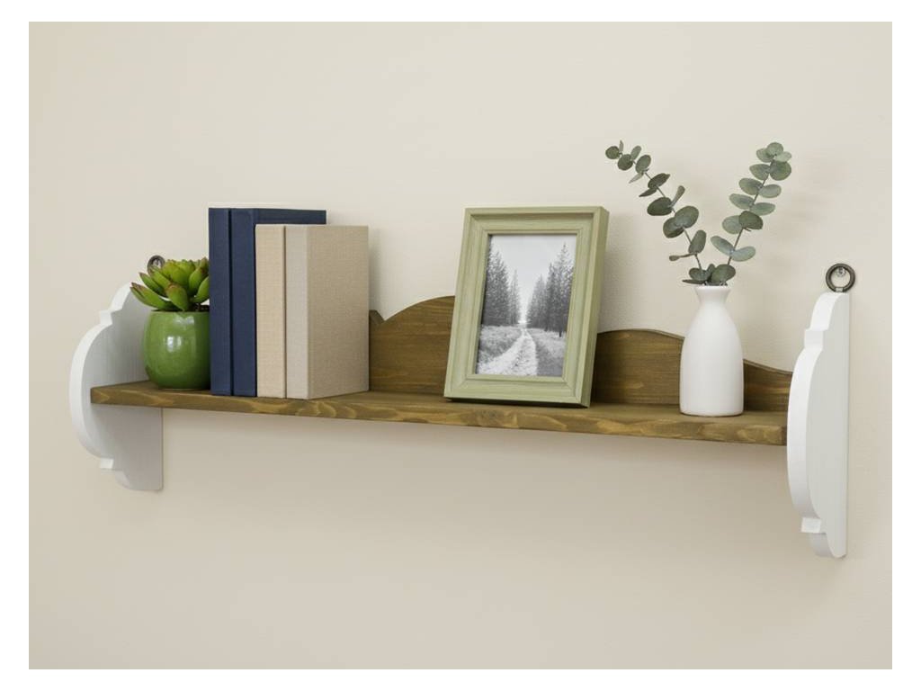 Dřevěná police POL13 je ošetřena pouze bílou vodou ředitelnou barvou. Hnědé plochy mohou být ošetřeny voskem anebo lakem.