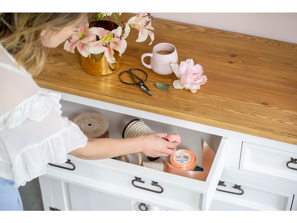 Nábytek WHITE HOME je vyroben z masivního borovicového dřeva, jen záda komod tvoří sololit a záda psacích stolů přírodní dýha. Zásuvky nemají kolejnice, ale jejich absence nebrání bezproblémovému vysouvání. Konečná úprava nábytku spočívá v ručním nanesení čistě přírodních vosků, díky kterým je nábytek stále krásny a hedvábně jemný. Vosk se používá ke konzervaci dřeva již od středověku. Jedná se o přírodní materiál, který má příznivé účinky na dřevo i dřevěný nábytek. Efektivní vzhled nábytku dotváří stylové kování a panty v černé barvě.