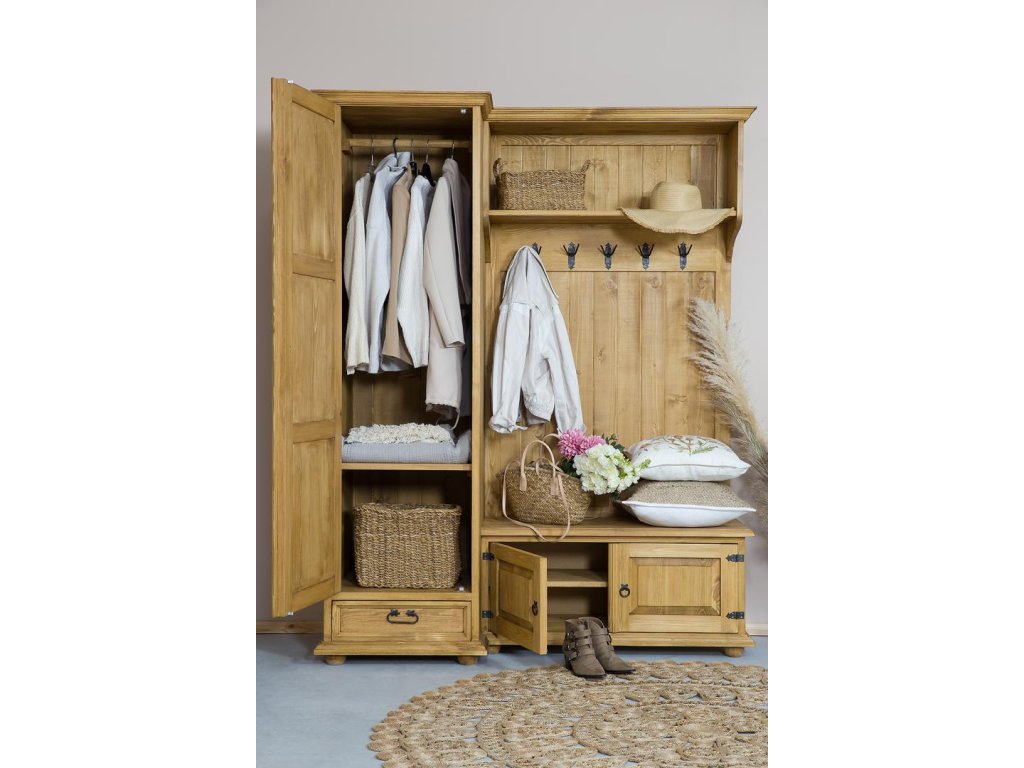 Rustikální předsíňová stěna WHITE HOME je vyrobena z borovicového masivu vysoké kvality. Předsíň má v horní části na pravé straně polici, zatímco po levé straně je umístěna skříň, která nabízí šatní tyč a polici ve spodní části. Skříňka s dvířky s dvířky nabízí polici. Předsíňová skříňka je opatřena stylovými kovovými úchyty a panty.