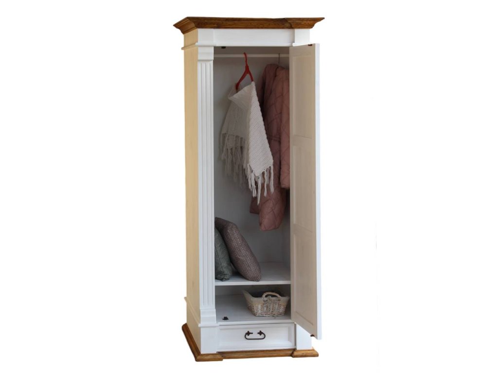 Vnitřní prostory rustikální skříň SWEET HOME nabízí šatní tyč, jednu polici ve spodní části a výsuvný šuplík na uchovávání všeho, co je vám libo. Stylové úchyty v retro stylu s efektem patiny dodávají skříni nadčasovou eleganci.
