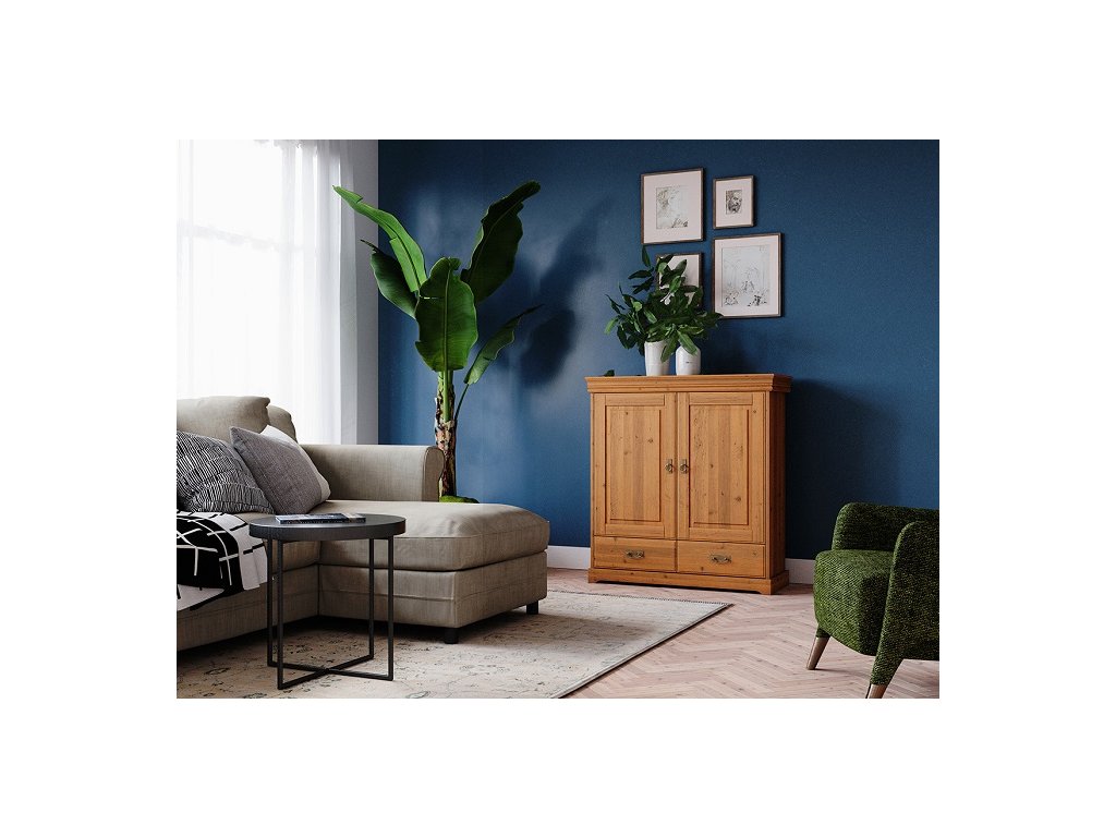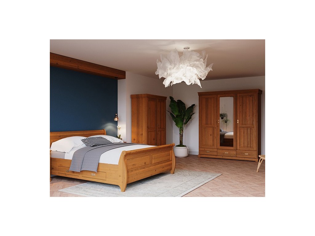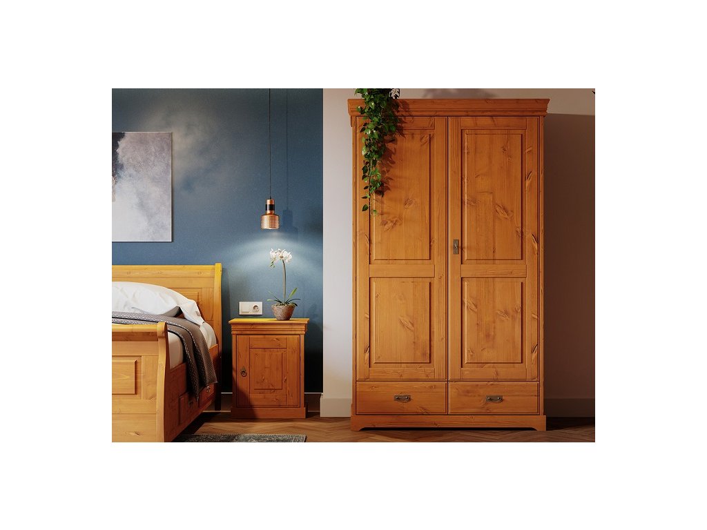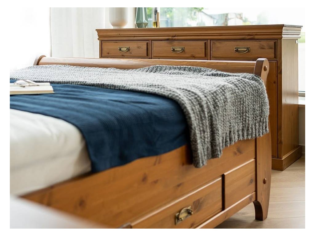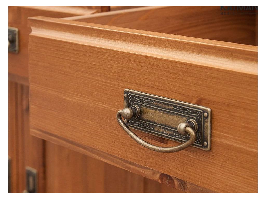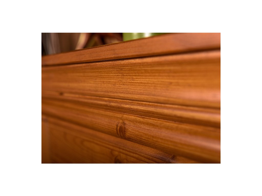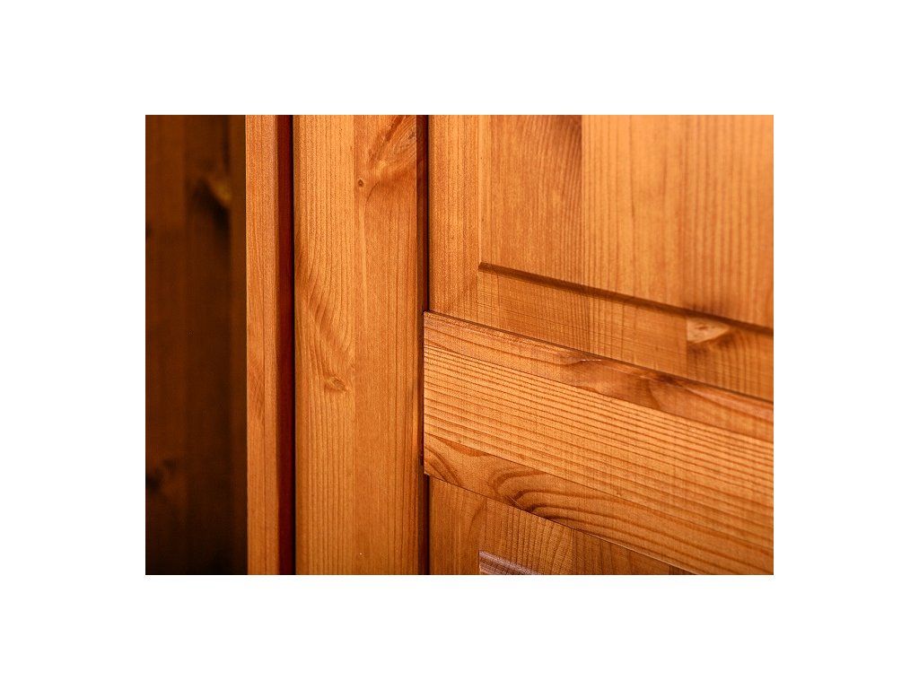 Rustikální skříň TOSKANIA z masivu je vyrobena z masivní finské borovice a namořen do teplého medového odstínu, které daruje interiérům hřejivé kouzlo domova. Finská borovice vyniká svojí odolnosti a nádhernou dřevitou strukturou, kterou můžeme cítit, při každém doteku. Dna šuplíku a záda skříně jsou vyrobeny z dřevovláknité desky HDF.