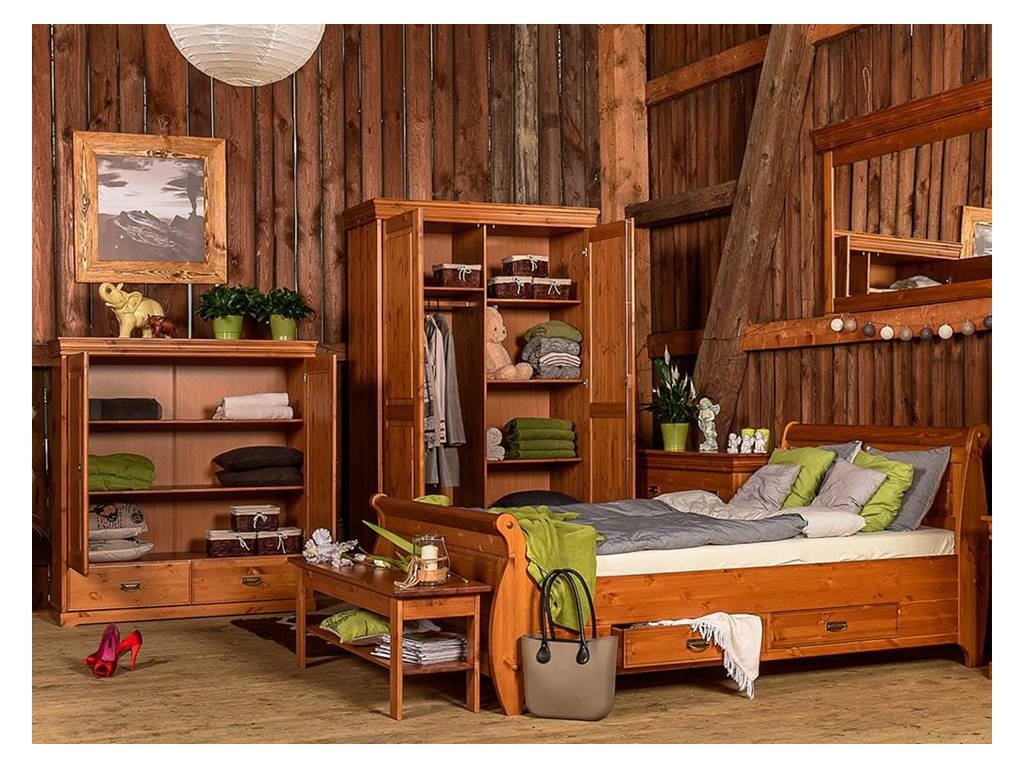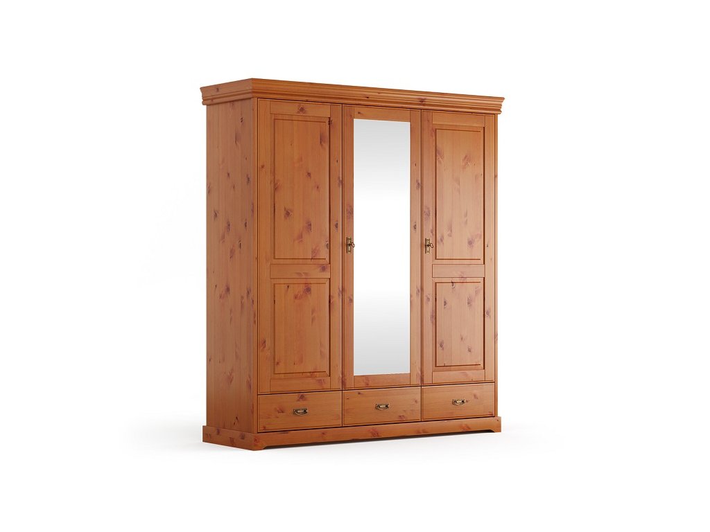 Rustikální kombinovaná skříň TOSKANIA se zrcadlem je vyrobena z masivní finské borovice v teplém medovém odstínu, které daruje interiérům hřejivé kouzlo domova.