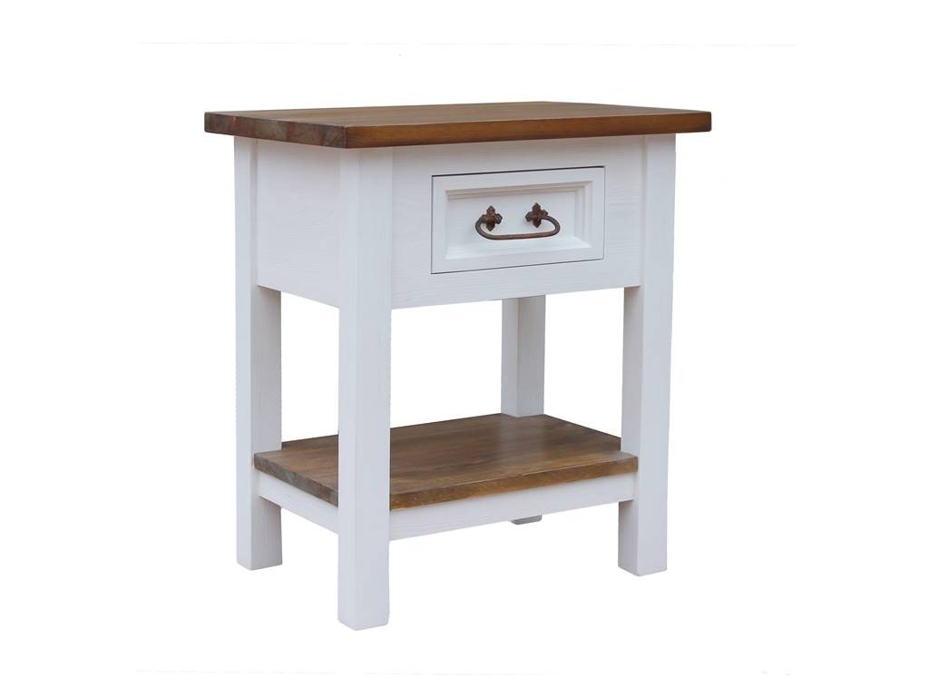 Rustikální stolek SWEET HOME je vyroben z masivního borového dřeva a ošetřen bílou vodou ředitelnou barvou. Horní hnědá deska může být ošetřena voskem anebo lakem.