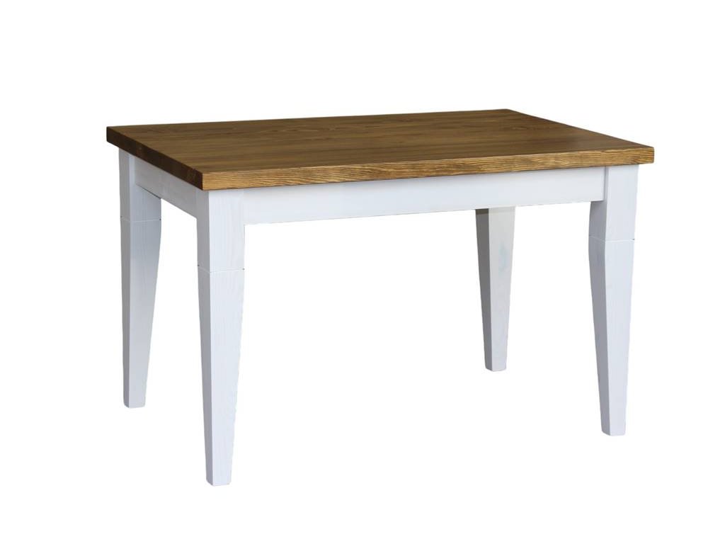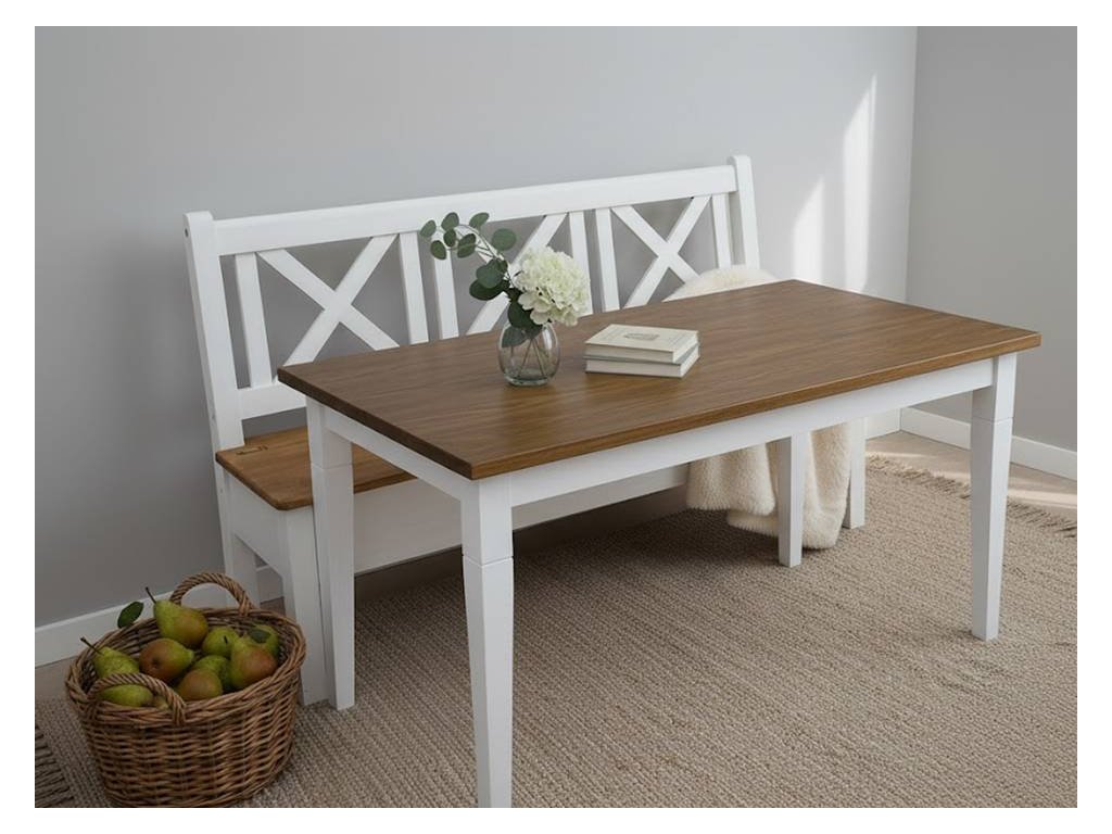 Rustikální stůl Ludvík je romantický jídelní stůl do kuchyně, který je vyroben z borovicového masívu a ošetřen bílou vodou ředitelnou barvou. Horní hnědá deska může být ošetřena voskem anebo lakem.