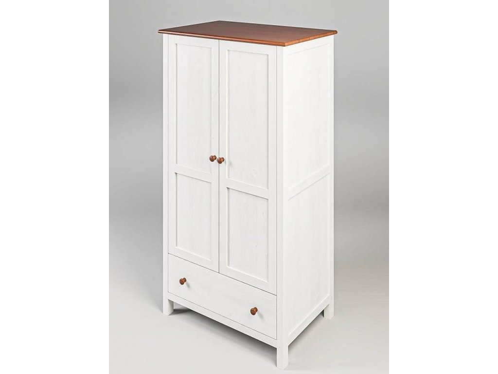 Šatní skříň Astra zaujme svým nadčasovým vzhledem inspirovaným stylem Provence. Vyrobena je z kvalitního smrkového masivu a povrchově ošetřena kombinací bílé a hnědé barvy, která podtrhuje přirozenou kresbu dřeva. Jemné linie a kontrastní provedení dodávají skříni romantický i elegantní charakter.