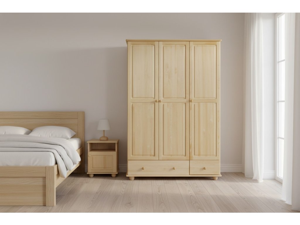 Šatní skříň DEJA7 je zhotovena z jakostního borového dřeva. Na to je nanesen transparentní, zdravotně neškodný lak. Tímto je šatní skříň chráněná před drobnými vnějšími poškozeními a zároveň vynikne i původní krása dřeva.