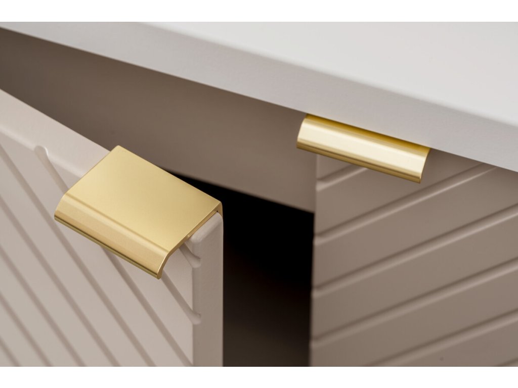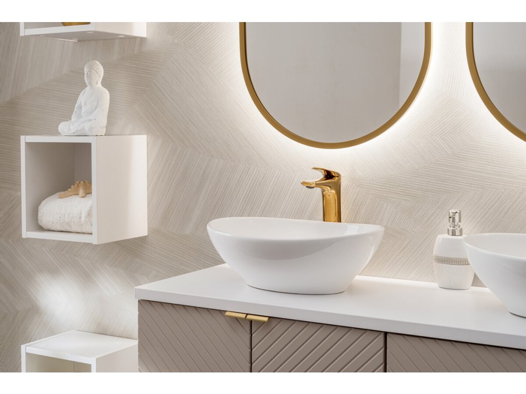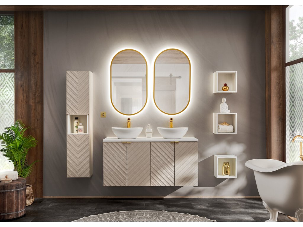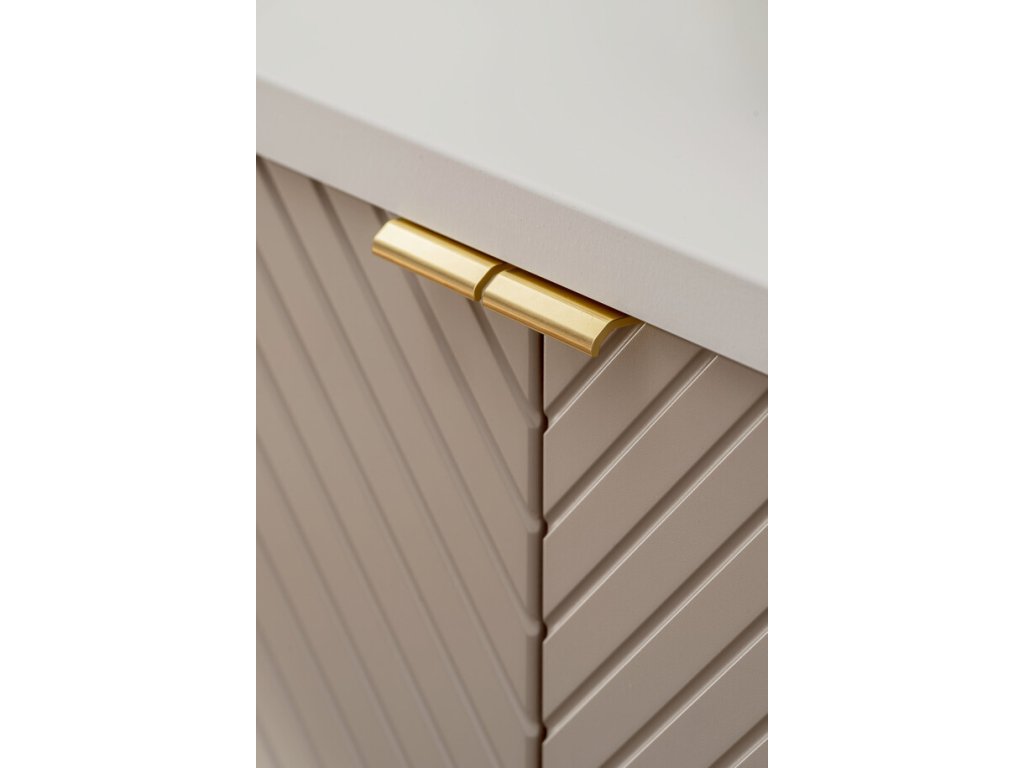 Skříňka do koupelny z kolekce Viva Kašmír zaujme elegantním odstínem kašmíru a trojrozměrnými frézovanými čely ve vzoru rybí kosti. Nabízí praktický úložný prostor, tiché dovírání dvířek a možnost výběru ze tří barev úchytek – zlatý lesk, chrom lesk nebo černý mat.
