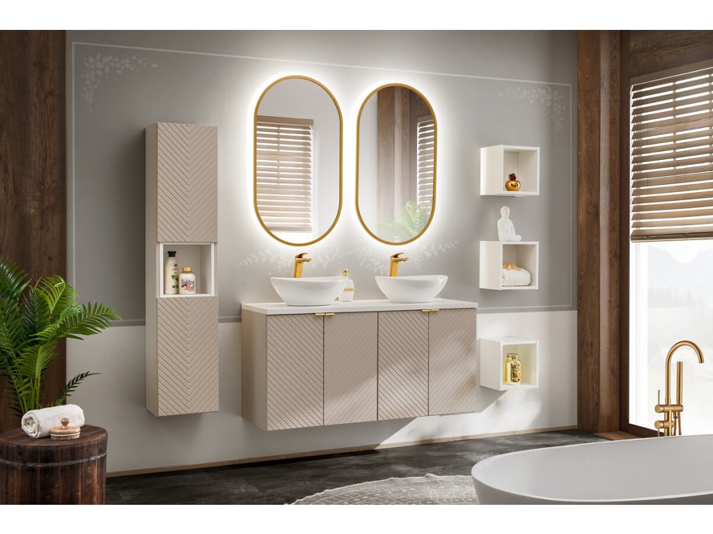 Skříňka do koupelny z kolekce Viva Kašmír zaujme elegantním odstínem kašmíru a trojrozměrnými frézovanými čely ve vzoru rybí kosti. Nabízí praktický úložný prostor, tiché dovírání dvířek a možnost výběru ze tří barev úchytek – zlatý lesk, chrom lesk nebo černý mat.