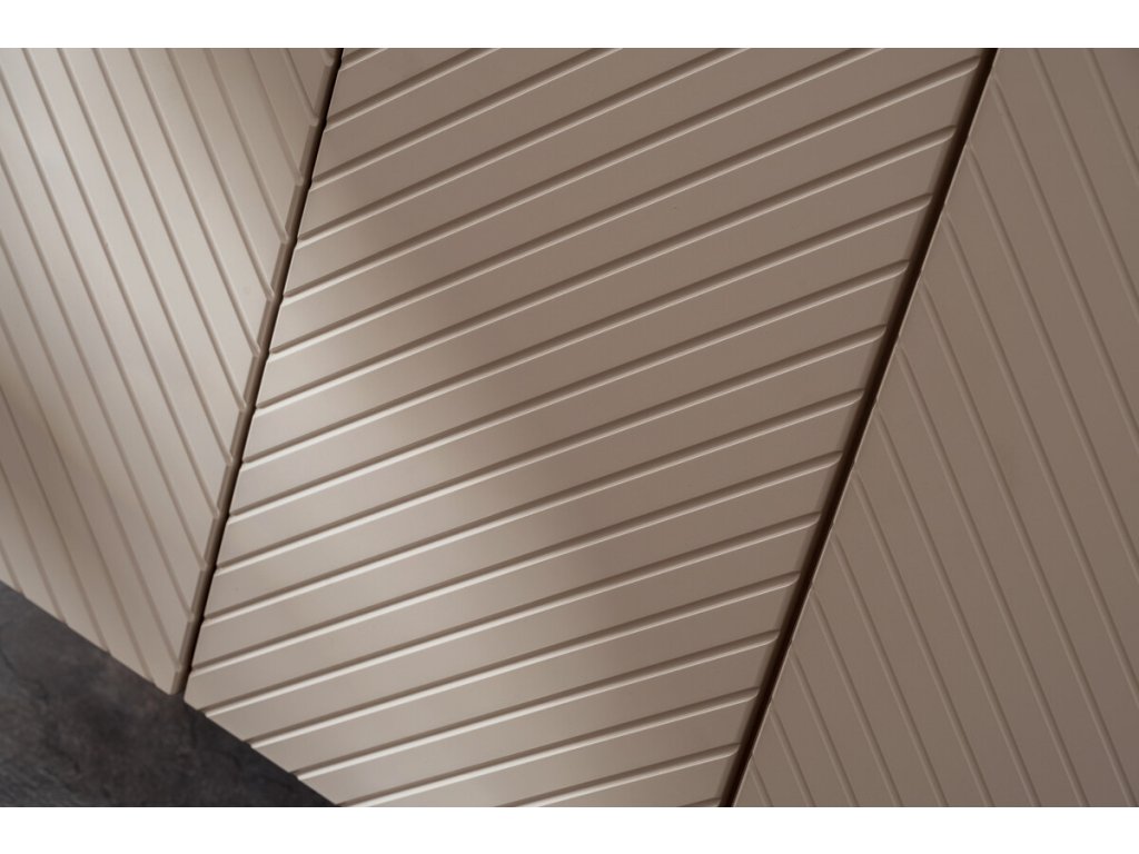 Skříňka do koupelny z kolekce Viva Kašmír zaujme elegantním odstínem kašmíru a trojrozměrnými frézovanými čely ve vzoru rybí kosti. Nabízí praktický úložný prostor, tiché dovírání dvířek a možnost výběru ze tří barev úchytek – zlatý lesk, chrom lesk nebo černý mat.