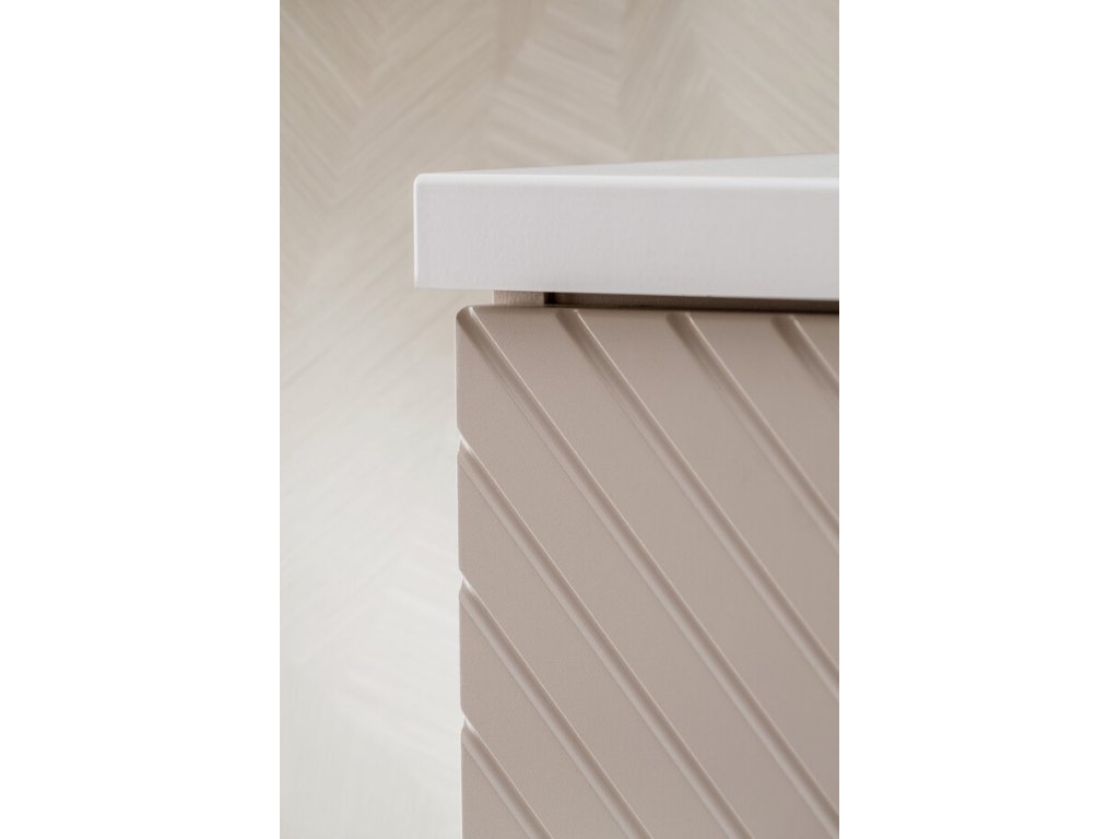 Skříňka do koupelny z kolekce Viva Kašmír zaujme elegantním odstínem kašmíru a trojrozměrnými frézovanými čely ve vzoru rybí kosti. Nabízí praktický úložný prostor, tiché dovírání dvířek a možnost výběru ze tří barev úchytek – zlatý lesk, chrom lesk nebo černý mat.