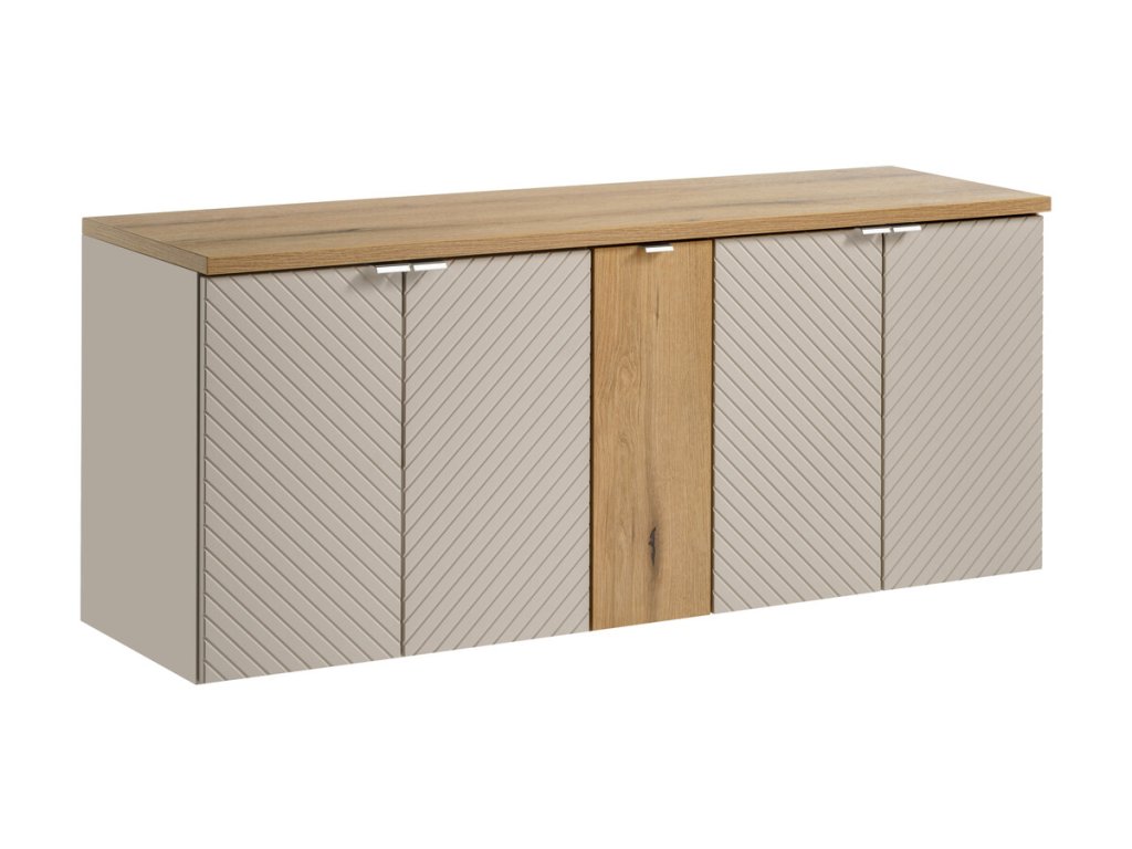 Skříňka do koupelny z kolekce Viva Kašmír zaujme elegantním odstínem kašmíru a trojrozměrnými frézovanými čely ve vzoru rybí kosti. Nabízí praktický úložný prostor, tiché dovírání dvířek a možnost výběru ze tří barev úchytek – zlatý lesk, chrom lesk nebo černý mat.