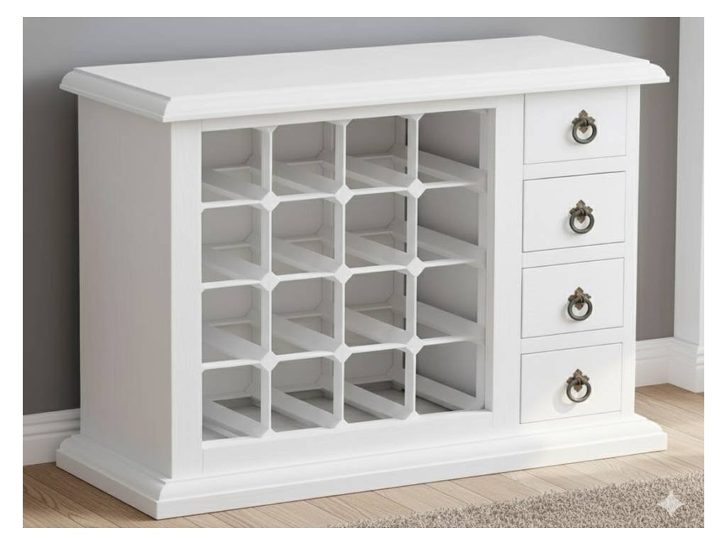 Skřínka na víno je vyrobena z borovice a ošetřena bílou vodou ředitelnou barvou. Hnědé části mohou být ošetřeny voskem anebo lakem.