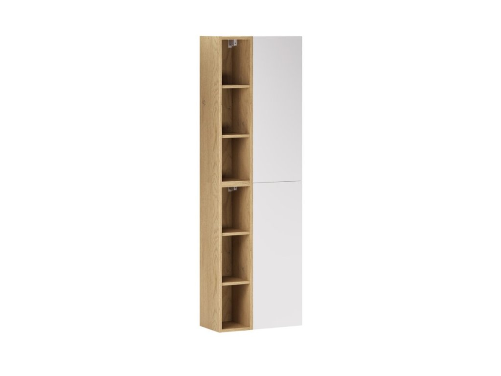 Koupelnová skříňka s regálem do z kolekce Aster White vyniká minimalistickým designem a elegantní matnou bílou v kombinaci s odstínem dub cremona. Díky systému „push to open“, tichému dovírání a možnosti kombinování více modulů nabízí praktické i stylové řešení pro moderní interiér.