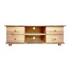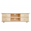Televizní stolek DEJ61 se skládá ze 4 výsuvných šuplíků, které jsou uchyceny na kvalitních kovových pojezdech a z 1 poličky. Úchytky jsou roztomile kulaté, rovněž z borovicového masívu. V zadní části televizního stolku jsou kulaté otvory na kabely, takže se nemusíte trápit složitým vyřezáváním nebo schováváním kabelů. Celý televizní stolek je postaven na 4 kulatých nožkách.