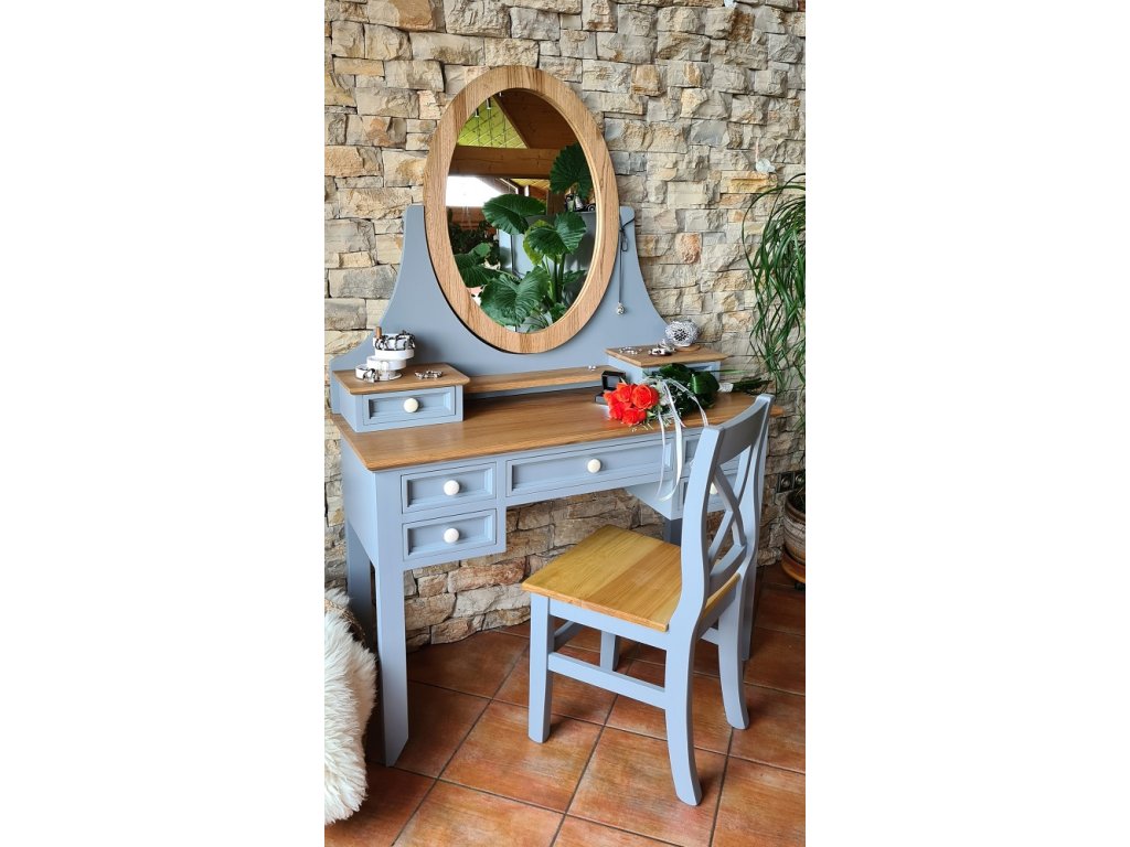 Masivní toaletní stolek PROVENCE je spojením bukového a dubového dřeva. Dubové dřevo (horní deska) je ošetřeno lakem a bukové dřevo je ošetřeno akrylovou barvou v šedomodré barvě. Šuplíky jsou bez pojezdu.