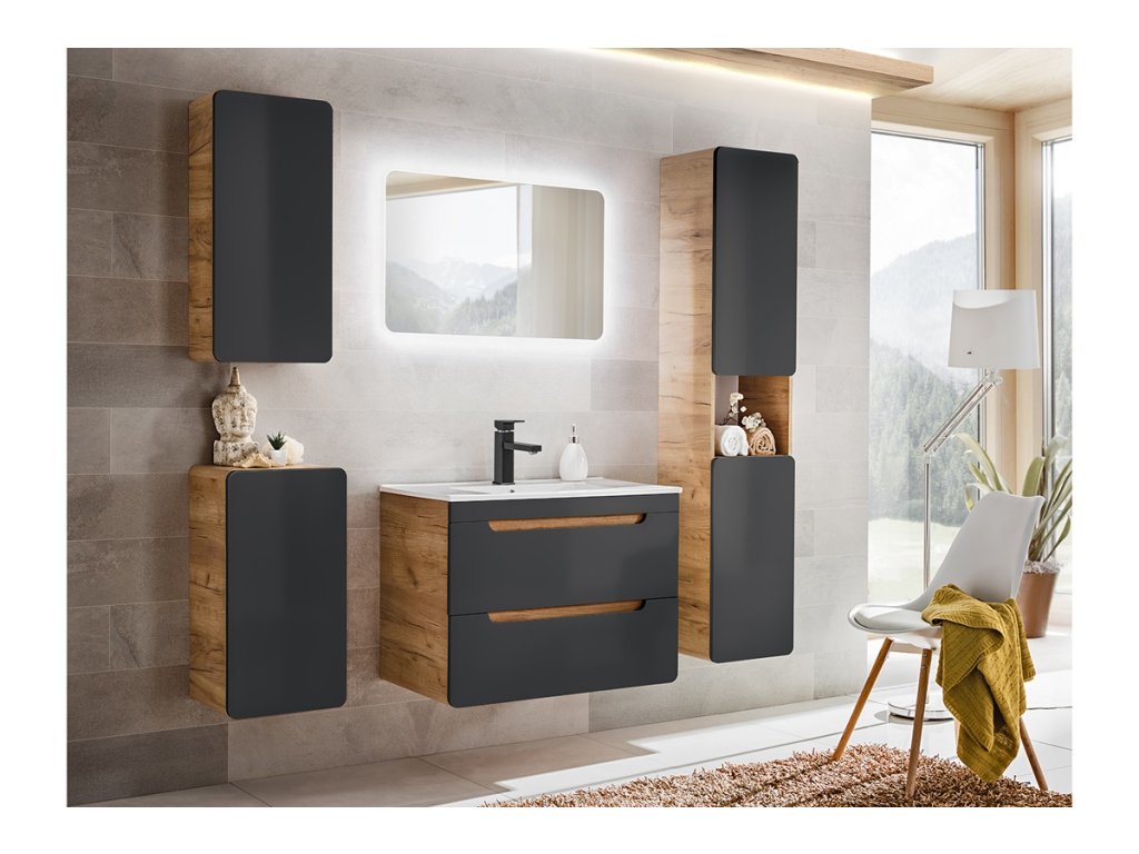 Umyvadlová skříňka Aruba Cosmos vytváří díky své stylové barevné kombinaci zlatého dubu s matnou černou neotřelý designový kousek, který se stane dominantou každé moderní koupelny.