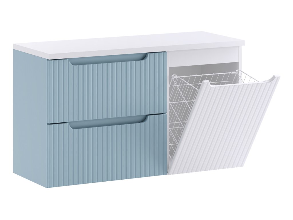 Skříňka pod umyvadlo 100 cm se dvěma zásuvkami a košem na prádlo z kolekce Nova Denim zaujme moderním minimalistickým designem, vertikálně rýhovanými čely a elegantním integrovaným úchytem.