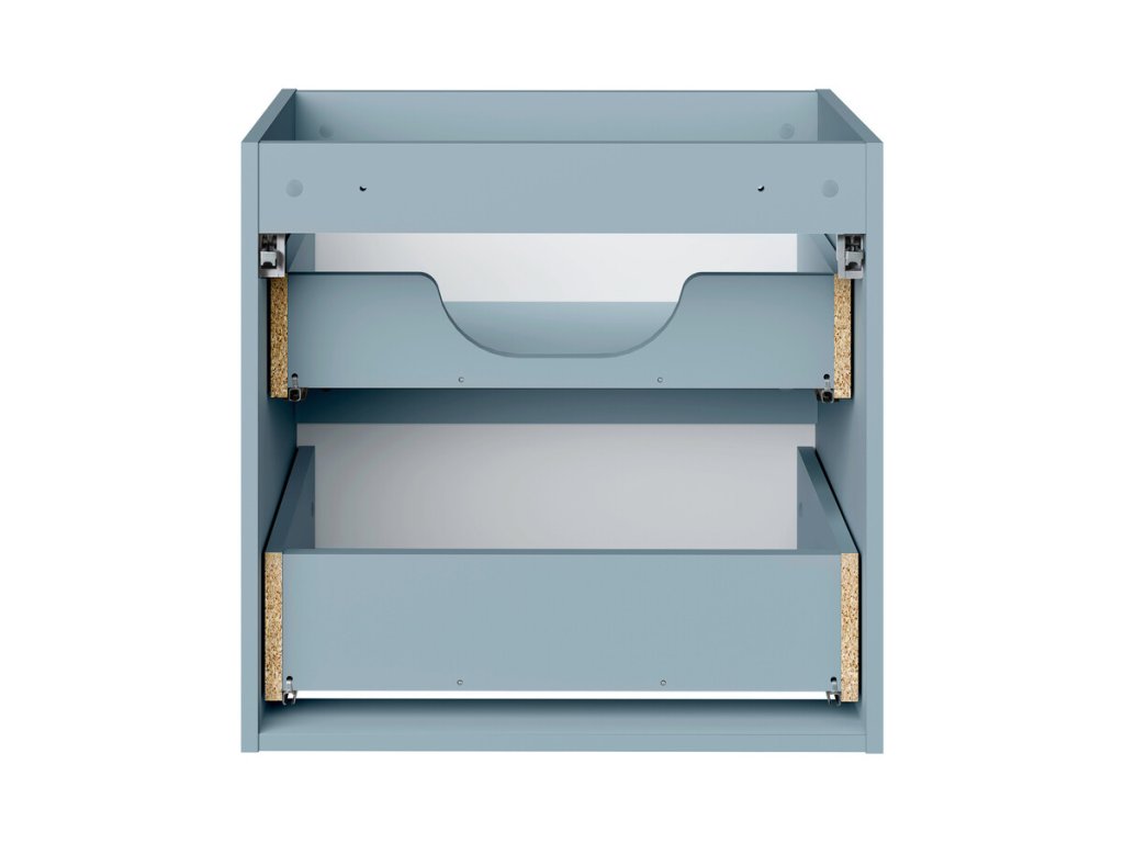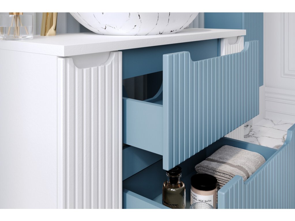 Skříňka je vybavena dvěma prostornými zásuvkami, které poskytují dostatek místa pro uložení koupelnových doplňků, kosmetiky i dalších nezbytností. Systém tichého dovírání zajišťuje plynulé a tiché zavírání zásuvek, což zvyšuje komfort při každodenním používání.