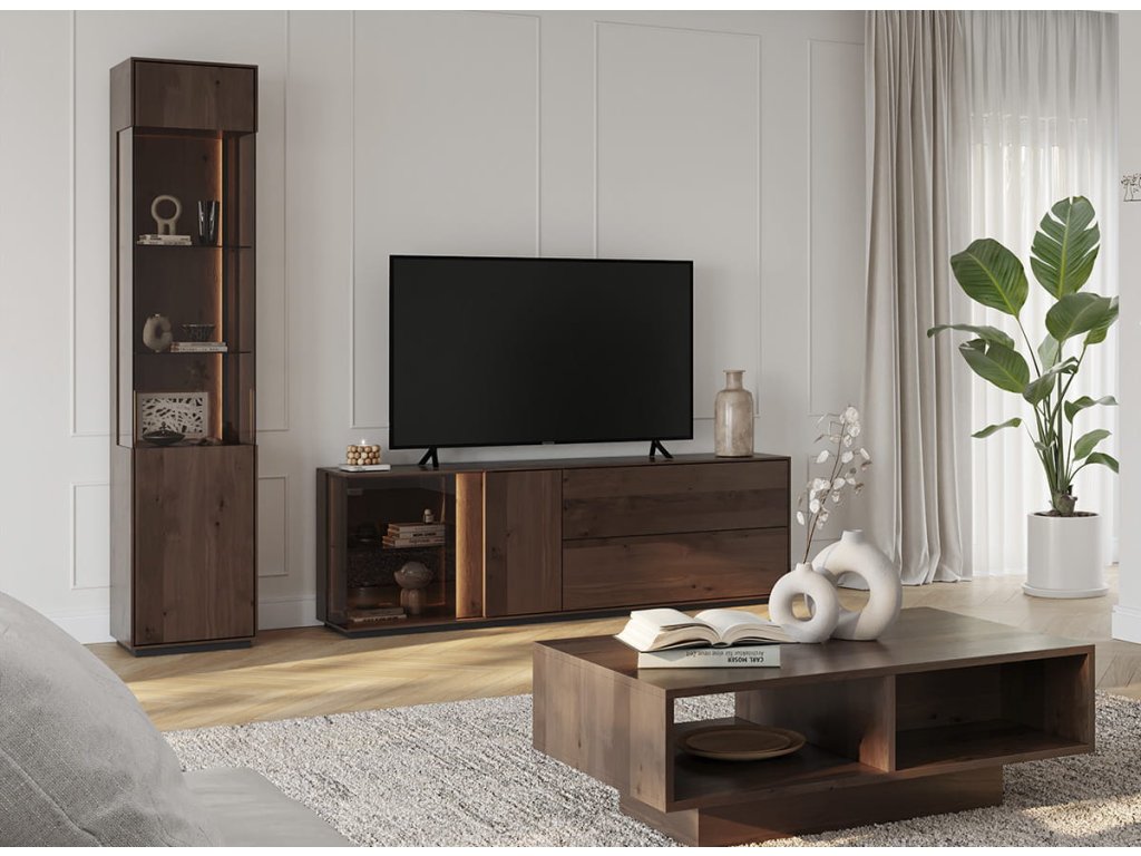 Vitrína z dubového masivu v elegantním tabákovém odstínu skloubí čistý design s praktičností, nabízí prosklený prostor s policemi pro vystavení dekorací a decentní osvětlení, které vytváří příjemnou večerní atmosféru.