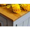 Masivní vitrína PROVENCE je spojením bukového a dubového dřeva. Dubové dřevo (horní deska) je ošetřeno lakem a bukové dřevo je ošetřeno akrylovou barvou v šedomodré barvě. Šuplíky jsou bez pojezdů. Možnost objednání se systémem tichého dovírání (u šuplíků).