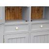Masivní vitrína PROVENCE je spojením bukového a dubového dřeva. Dubové dřevo (horní deska) je ošetřeno lakem a bukové dřevo je ošetřeno akrylovou barvou v šedomodré barvě. Šuplíky jsou bez pojezdů. Možnost objednání se systémem tichého dovírání (u šuplíků).
