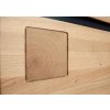 Vitrína REGATA jistě zaujme svým nápaditým designem. Hladké hřejivě zbarvené dubové dřevo je v horní části přerušeno prosklenými dvířky, které odhalují police vitríny. Spodní část je od té horní oddělena černě zbarvenou dubovou vložkou, která má kromě estetické funkce také praktický význam, jelikož usnadňuje otevírání dvířek. Dvířka uzavřeného úložného prostoru jsou zdobena čtvercovým výřezem z trámu, který krásně koresponduje s přirozenými liniemi masivu.