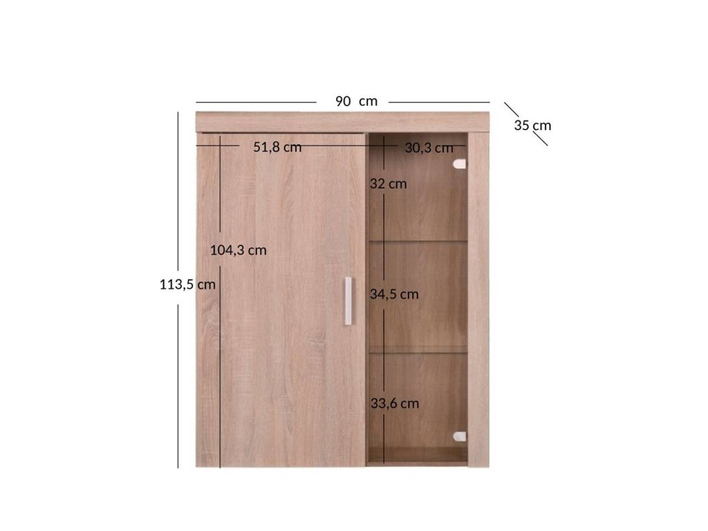 Závěsná vitrína DAMY 1D1W v oblíbeném dekoru dub Sonoma je ideální pro menší i moderní interiéry. Tato kompaktní skříňka z lamina dub Sonoma se skleněnými dvířky šetří prostor a zároveň působí elegantně. Je vyrobena z kvalitního LDTD 16 mm s ABS hranou 0,5 mm, má plastové úchyty a je dodávána v demontu. Vybrané kusy lze doplnit o LED osvětlení.